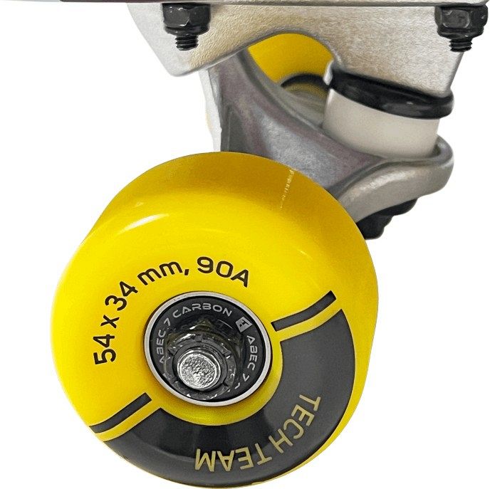 - Колёса с хорошим сцеплением и плавным ходом. Полиуретановые колёса 54×34 мм (90A) дают оптимальный баланс между жёсткостью и амортизацией, а подшипники ABEC 7 carbon делают ход лёгким и быстрым.