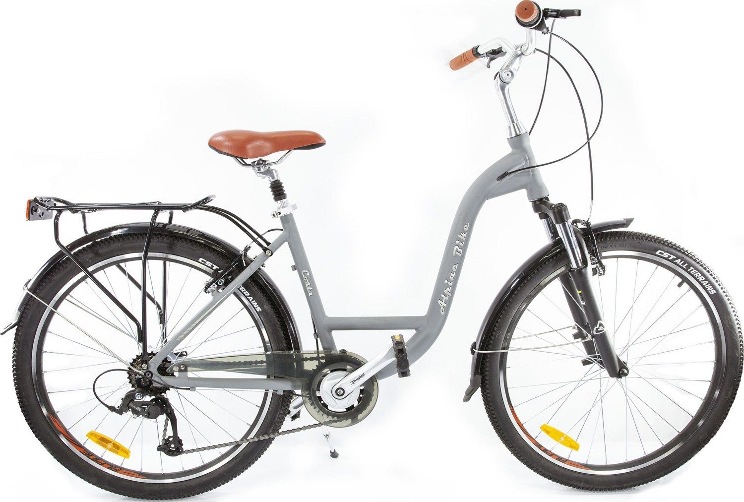 Переключение передач осуществляется с помощью 7-скоростной трансмиссии от Microshift, а торможение надежно обеспечивают легкие ободные тормоза V-Brake от Promax. Велосипед собран на 26-дюймовых колесах с двойными алюминиевыми ободами, что обеспечивает прочность и надежность. Велосипед оборудован универсальными покрышками CST All Terrains, которые отвечают за хороший накат и уверенный зацеп на различных поверхностях. Полноразмерные пластиковые крылья защитят вас от грязи, а защита цепи позволит кататься в любой одежде без опасений повредить ее. Багажник с надежным зажимом позволяет удобно перевозить различные грузы. Для удобства парковки предусмотрена алюминиевая подножка.