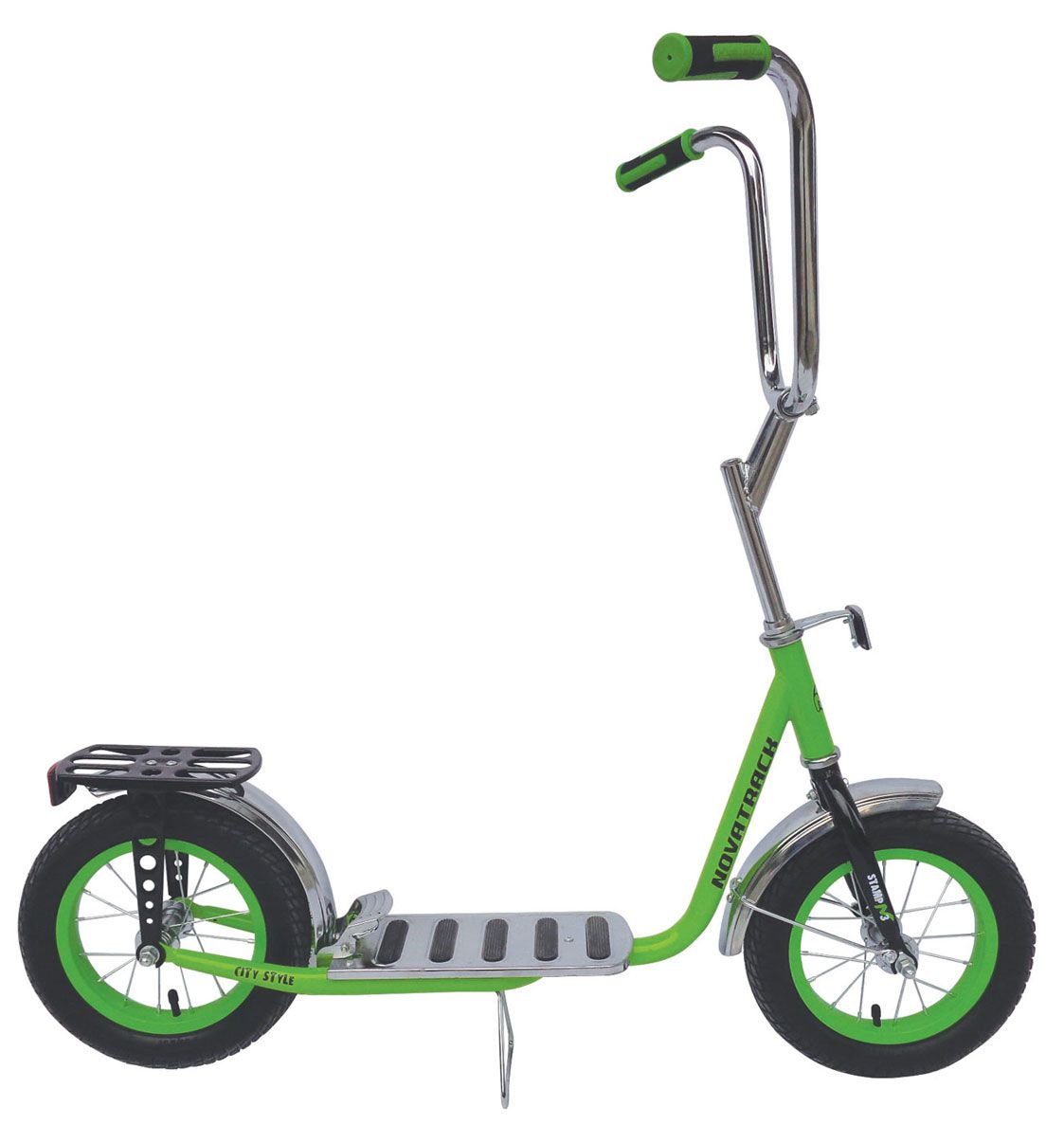 Самокат Novatrack STAMP N3 с колесами 12" - это самокат оснащенный дополнительными элементами безопасности. Во-первых, катафоты, установленные спереди, во-вторых, удобный и надежный ножной тормоз, в-третьих особое покрытие площадки самоката обеспечит надежное сцепление подошвы обуви, а значит нога не соскользнет! А широкие надувные колеса позволят кататься не только по асфальтовым дорожкам, но и с легкостью преодолевать парковые тропинки. Надувные колеса имеют ряд ощутимых преимуществ. Они бесшумны, с мягкими колёсами поездка будет мягче и комфортнее. Хорошо защищают от неровностей благодаря амортизирующим свойствам. Такие колёса комфортны при езде по неровным дорогам. В дождливую погоду надувные колеса увереннее держатся в поворотах. Они отлично тормозят и не скользят на разных поверхностях. Благодаря отличному сцеплению, помогают развивать более высокую скорость.
