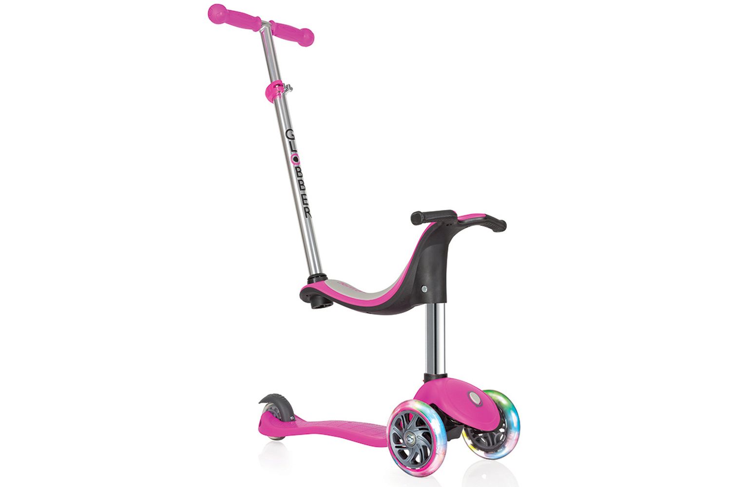 Главная особенность этой модели высокая безопасность ребенка, которая обеспечивается благодаря очень низкой платформе, блокировке руля, усилителю руля и возможности отрегулировать его по высоте. Благодаря специальному сидению, этот самокат можно превратить в беговел для детей примерно от 1 года и 3 месяцев. Благодаря ручке управления, можно без проблем контролируя катать детей от 12 месяцев. Четыре положения, четыре функции в одном продукте