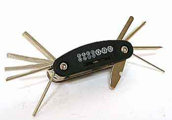 Компактный мультитул с набором шестигранников и накидных головок. Выполнен из стали с пластиковой рукояткой.