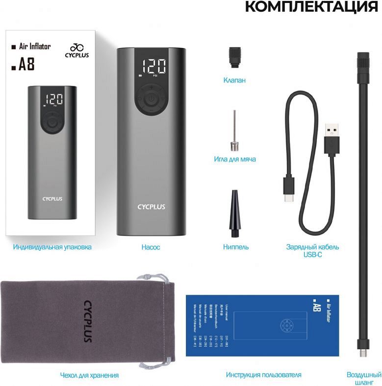Компрессор для шин Cycplus A8 имеет 2600 мАч встроенный перезаряжаемый литиевый аккумулятор с зарядным шнуром Type-c, поддерживает быструю зарядку QC 3.0. Он может накачать 3 автомобильные шины, 12 велосипедных шин или 40 баскетбольных мячей всего за одну полную зарядку. Для накачки одной полностью спущенной велосипедной шины требуется всего 3 минуты, для одной автомобильной шины 205/55R17 – 8-12 минут. Cycplus A8 может отображать давление в реальном времени на светодиодном дисплее при подключении к шине. Встроенная светодиодная аварийная лампа воздушного компрессора позволяет удобно накачивать и менять шины в темноте.