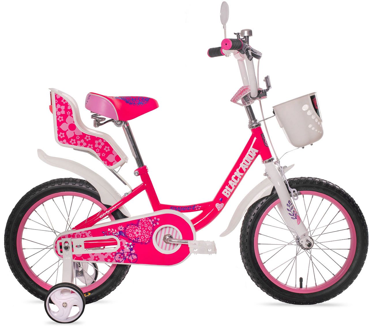 В комплект велосипеда Sweet для девочек входит зеркало, пластиковая передняя корзина, звонок, крылья и специальная защита цепи, которая защищает от попадания мелких предметов. Предусмотренная в данной комплектации еврокаретка обеспечивает более тщательную защиту подшипника.
