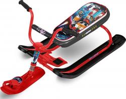 Снегокат оснащён велорулём, который обеспечивает лёгкость управления и добавляет элемент спортивного стиля. Система амортизации делает катание более плавным и комфортным, смягчая удары и вибрации при движении по неровной поверхности. Буксировочный трос с автоматической намоткой делает транспортировку снегоката удобной и простой.