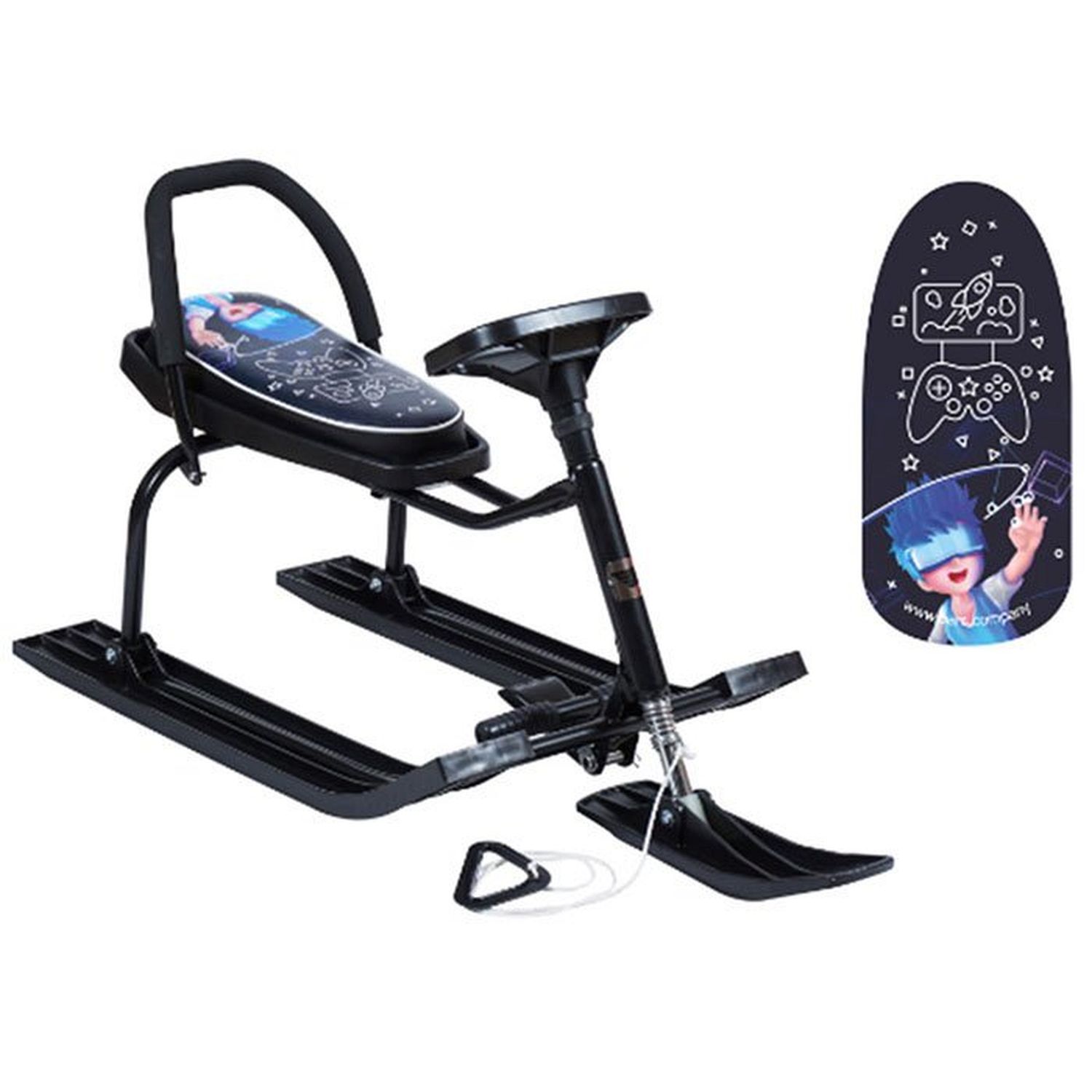 Яркий маневренный спортивный снегокат оценят и дети, и взрослые. Это и отличный вариант для семейного досуга. Эта модель оснащена лыжами, которые позволяют ехать и вперед и назад, а также эргономичным рулем.Модель имеет прочный металлический каркас, удобное сиденье и классическое расположение полозьев. Ребенок может управлять движением снегоката при помощи руля, который направляет ведущую переднюю лыжу. Также имеется прочная веревка с удобной пластиковой ручкой, при помощи которой снегокат легко перемещать. Снегокат имеет мягкое сиденье с принтом. Имеется усиленный буксировочный тормоз.