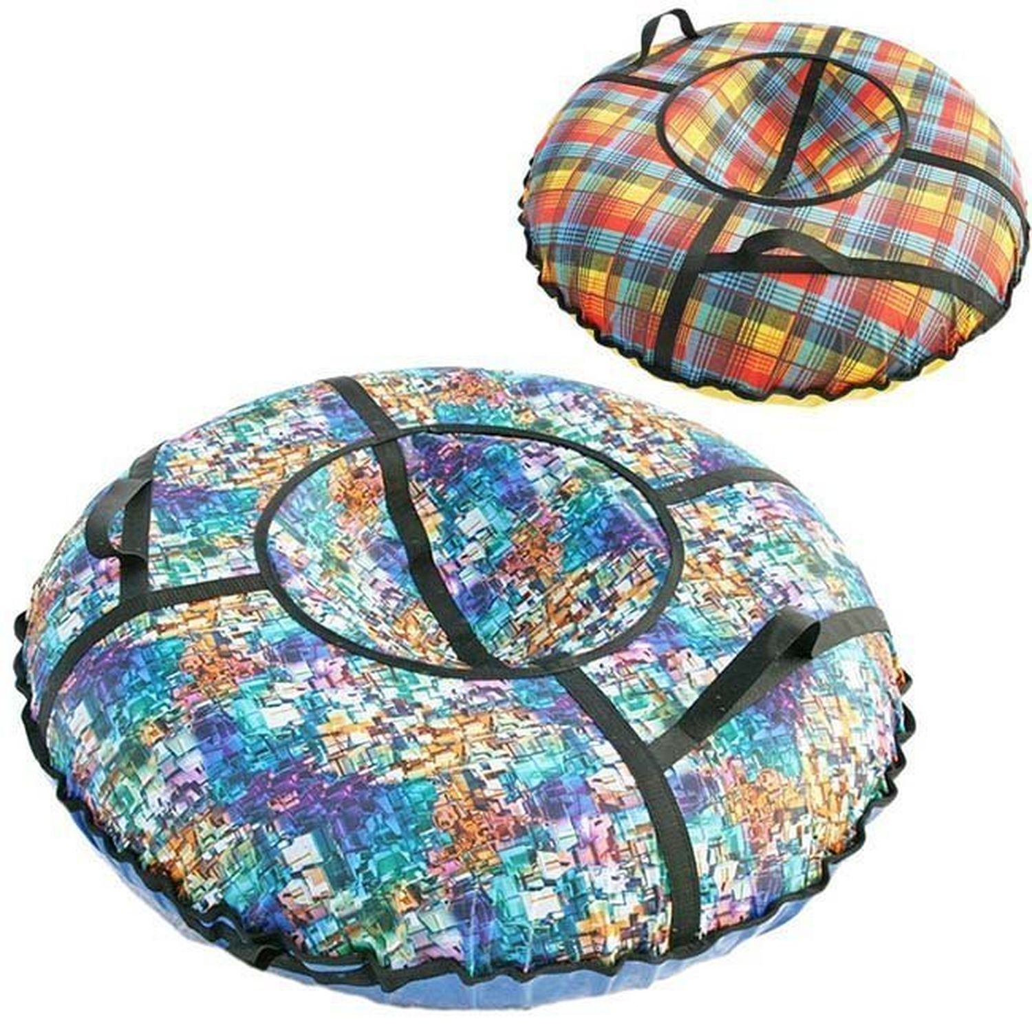 Верх и дно тюбинга выполнено из ПВХ материала высокого скольжения плотность материала 600-650 гркв.м. Все швы и посадочное место усилены капроновой лентой. Имеются буксировочный ремень и удобные ручки, а также замок от проникновения снега во внутрь чехла.