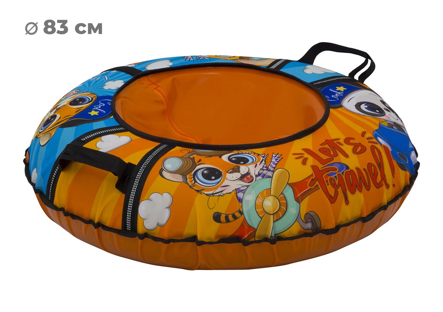 Размер тюбинга составляет 83 см, этот размер позволяет кататься на нём детям ростом до 110 см. Данный тюбинг выдерживает вес до 50 кг