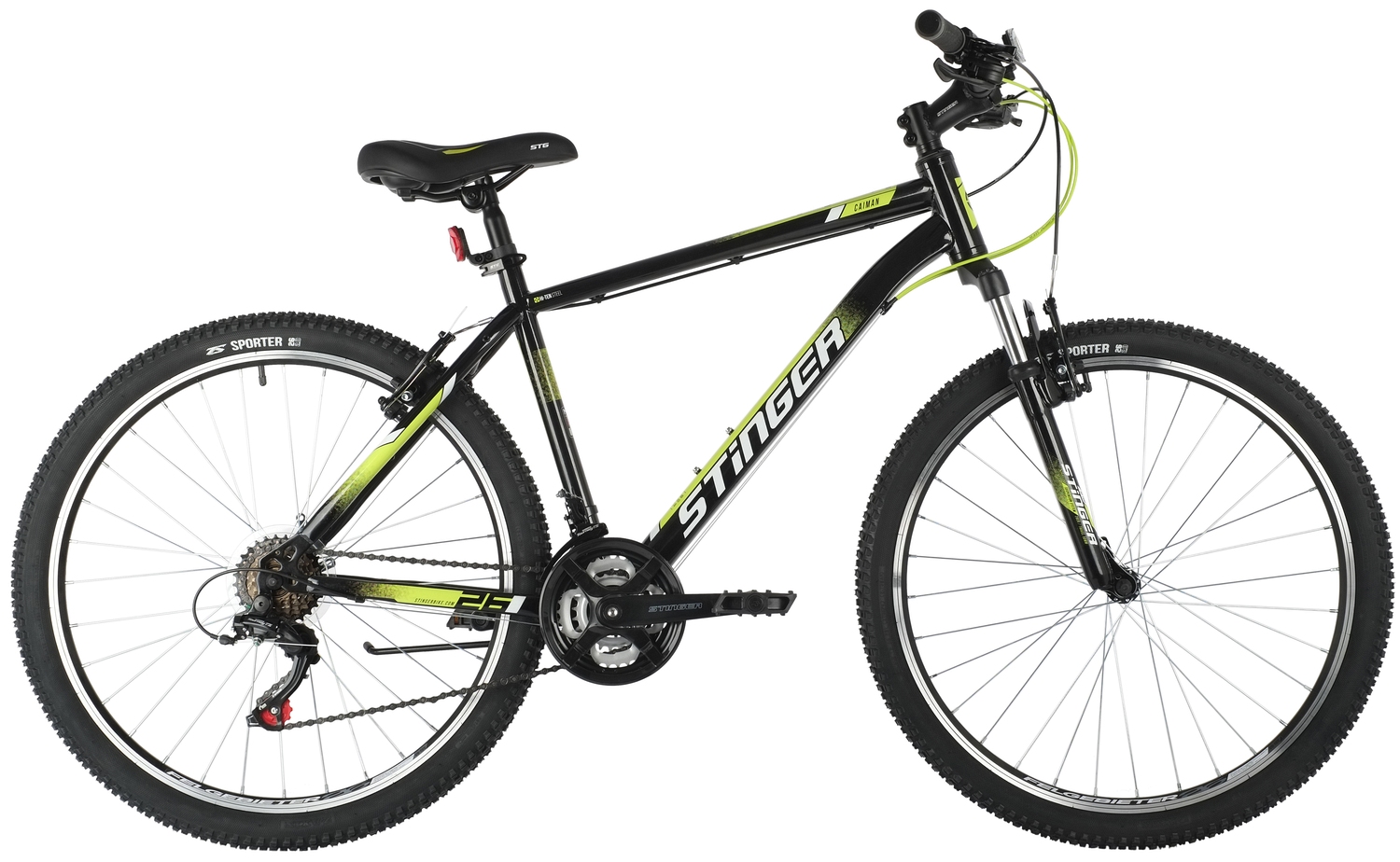 Производитель использует в байках STINGER CAIMAN только высококачественные оригинальные комплектующие, гарантирует длительный рабочий ресурс и полную безотказность велотехники. Усиленная рама из стали, созданная по технологии Hi-Tensile, обеспечивает высокий уровень надежности, а универсальная амортизационная вилка модели Stinger имеет ход на 60 мм и обеспечивает максимальный уровень комфорта при езде по бездорожью. Специальный протектор на покрышках Z-Axis гарантирует плотное сцепление колес с дорожным покрытием, что обещает велосипедисту идеальные показатели по управляемости и точности хода байка.